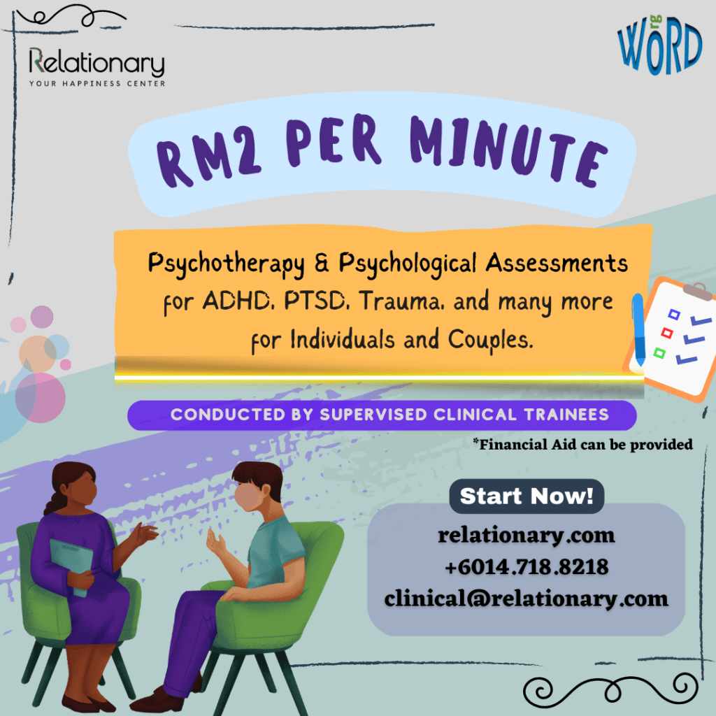 The therapy sessions will be attended by two interns during their training programme at Relationary. Services provided by our trainees are supervised by our team of psychology supervisors, overseen by Mr. Ammar Abuzahra (Registered Counselor at LKM, S-19).